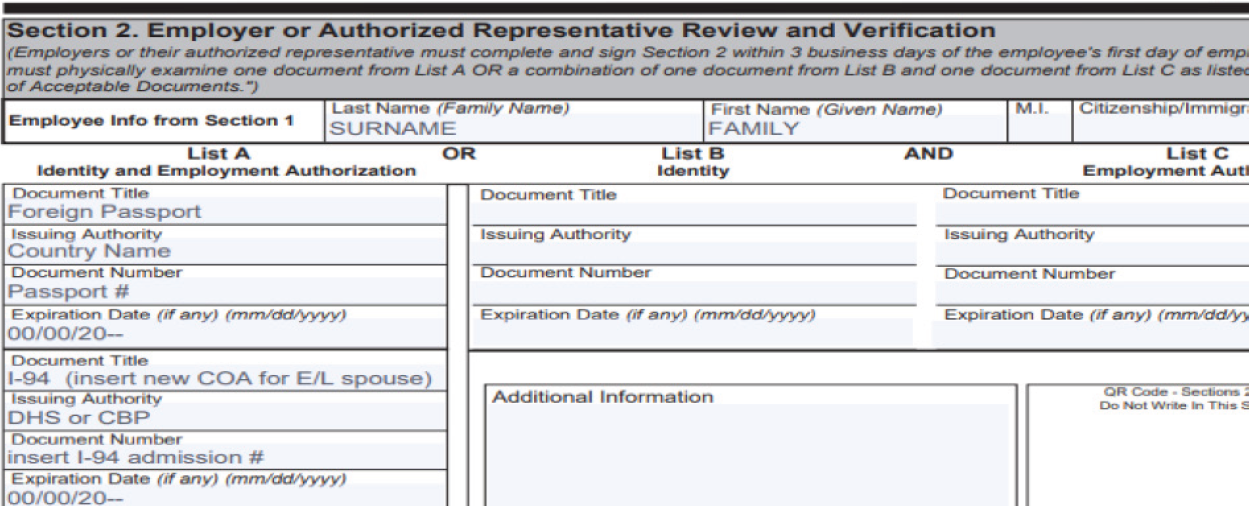 上記のとおり、USCISもCBPも、まだ新しいCOAコードの注書きが付いたI-94を、フォームI-9の就労許可の目的で使用できかどうかについて、明確にしていません。従って、この要件が更新されるまでは、フォームI-9を完成させるためには、EADが必要となります。なお、2022年1月31日時点で、すでに米国に滞在しているEおよびLの扶養家族は、上記のとおり、一度出国して米国へ再入国することで、新しいCOAコードが付いたI-94を取得できます。2022年1月31日以降に米国に入国するEおよびLの配偶者のI-94には、適切なコードが記載されているはずです。