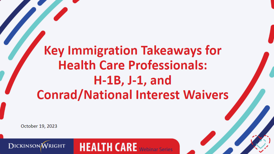 Join us Thursday, October 19, 2023, for an exciting and informative webinar, "Key Immigration Takeaways for Health Care Professionals: H-1B, J-1, and Conrad/National Interest Waivers." This one-hour webinar is specifically designed for Human Resources Professionals, Nurses, Dental and Physician Groups, Hospitals, and Physical Therapists seeking immigration strategies tailored to their unique needs.