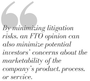 A freedom to operate opinion (FTO) is a legal opinion from a qualified intellectual property attorney that concludes a proposed commercial product or process may be made, used, sold, or offered for sale without infringing another party’s intellectual property rights. Although there is no legal requirement for a company to obtain an FTO opinion before taking a new product, process, or service to market, obtaining one can be very beneficial as a preemptive measure to aid in defending a company in patent litigation against assertions of willful infringement and exposure to treble damages. By minimizing litigation risks, an FTO opinion can also minimize potential investors’ concerns about the marketability of the company’s product, process, or service.