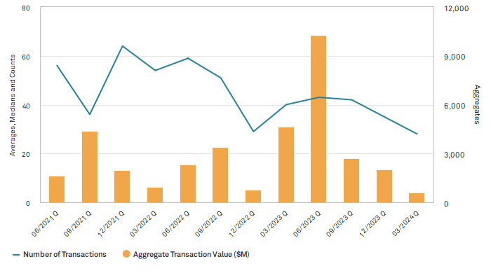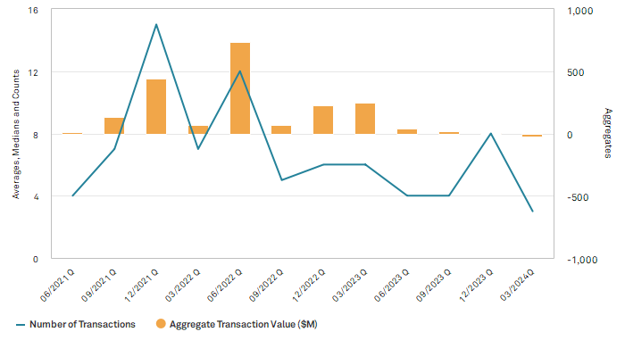 Only 19 EV-related M&A transactions were announced or completed in the United States and Canada during the TTM ended March 2024, a 34% U-turn from the 29 transactions during the TTM ended March 2023. The disclosed aggregate transaction value plummeted to $0.03B during the TTM, ended March 2024, from $1.3B during the TTM, ended March 2023.