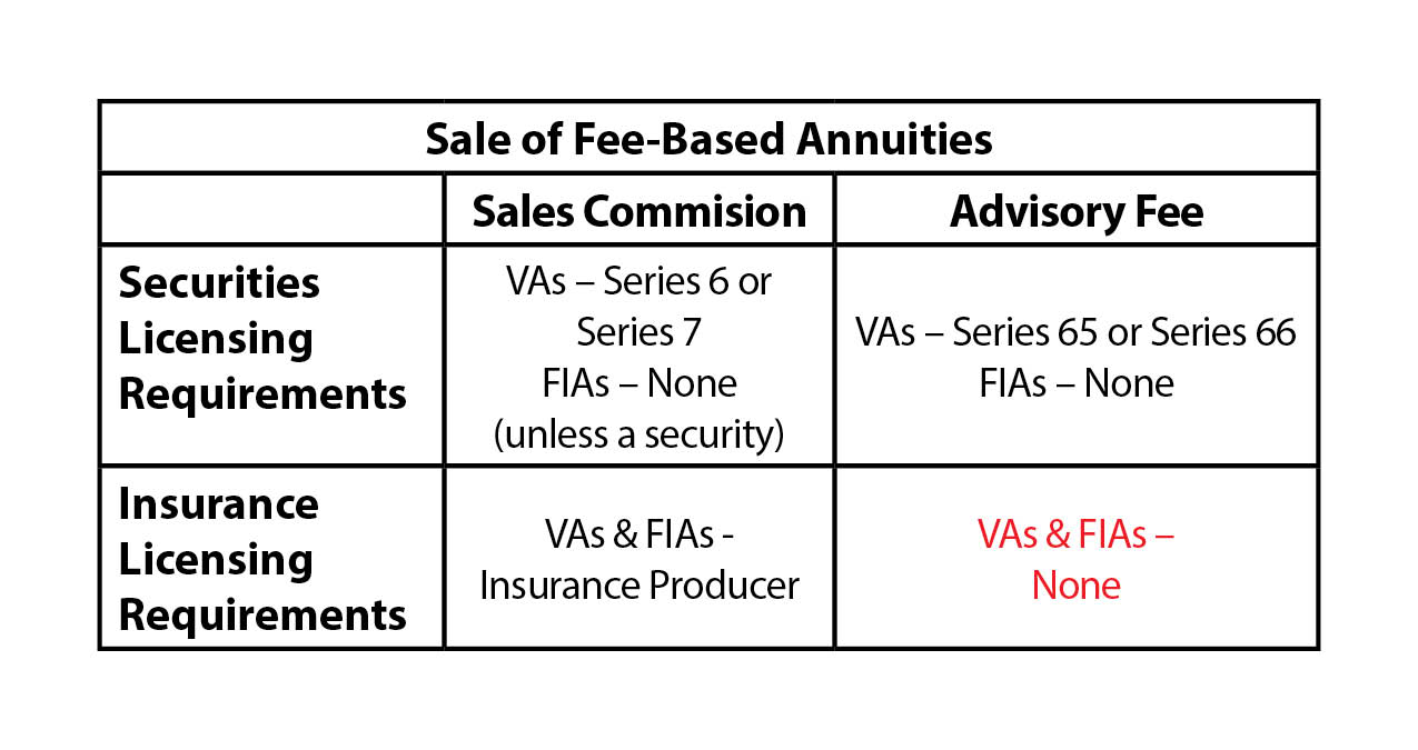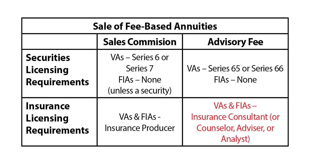 So what happens when the VA no longer pays a sales commission and instead pays an ongoing advisory fee? Financial planners are correct that FINRA broker registration is no longer required. Instead, they must operate as an investment adviser representative (“IAR”) of an RIA, either by obtaining a Series 65 (or Series 66) license or holding one of several professional designations.[xi] The conclusion about IAR status is certainly correct for fee-based VAs, since a financial planner will receive an ongoing advisory fee as payment for advice about a security. In the case of fee-based FIAs, IAR status would be largely inapplicable because FIAs are rarely securities.