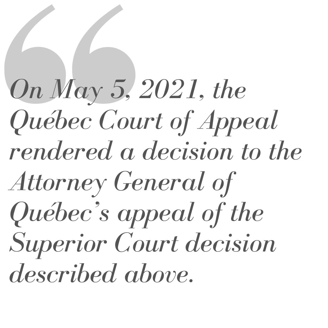 On May 5, 2021, the Québec Court of Appeal rendered a decision to the Attorney General of Québec’s appeal of the Superior Court decision described above. After re-examining the intrinsic evidence, the extrinsic evidence, and the legal and practical effects of the Provincial Provisions, the Court of Appeal concluded that the Superior Court did not err in determining the true pith and substance of the provisions. Justice Gagnon, writing on behalf of the Court of Appeal, found that the Superior Court was correct in finding that in adopting the Provincial Provisions, the Québec legislature intervened in the exclusive federal jurisdiction over telecommunications. Justice Gagnon summarized and followed the line of precedents which confirmed that telecommunications, and by extension the regulation of the transmission and reception of signals transmitted by ISP networks and installations, is a federal matter.