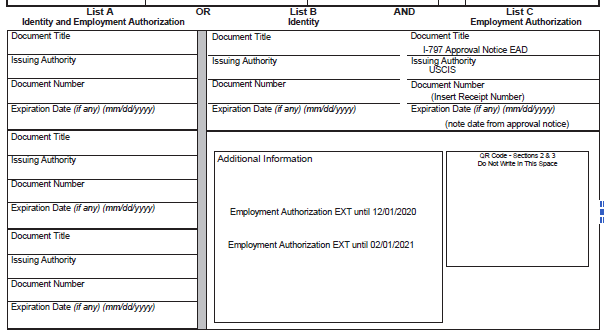 以前の延長措置の適用を受けて2020年12月1日までの措置としてI-797をEADカードの代替として使用していた場合に、まだ当該従業員がEADカードを受け取っていない場合、雇用主はフォームI-9の以下の追加情報欄に“Employment Authorization Ext Until 02/01/2021.”と記載してアップデートする必要があります。記載例は以下のとおりです。