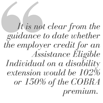 A qualified beneficiary who remains eligible for COBRA coverage beyond 18 months due to a disability extension or the occurrence of a second qualifying event (such as a divorce that occurs within 18 months of coverage based on a reduction in hours or involuntary termination) is eligible for a COBRA subsidy if the qualified beneficiary has elected and remained on COBRA during the extended period. It is not clear from the guidance to date whether the employer credit for an Assistance Eligible Individual on a disability extension would be 102% or 150% of the COBRA premium.