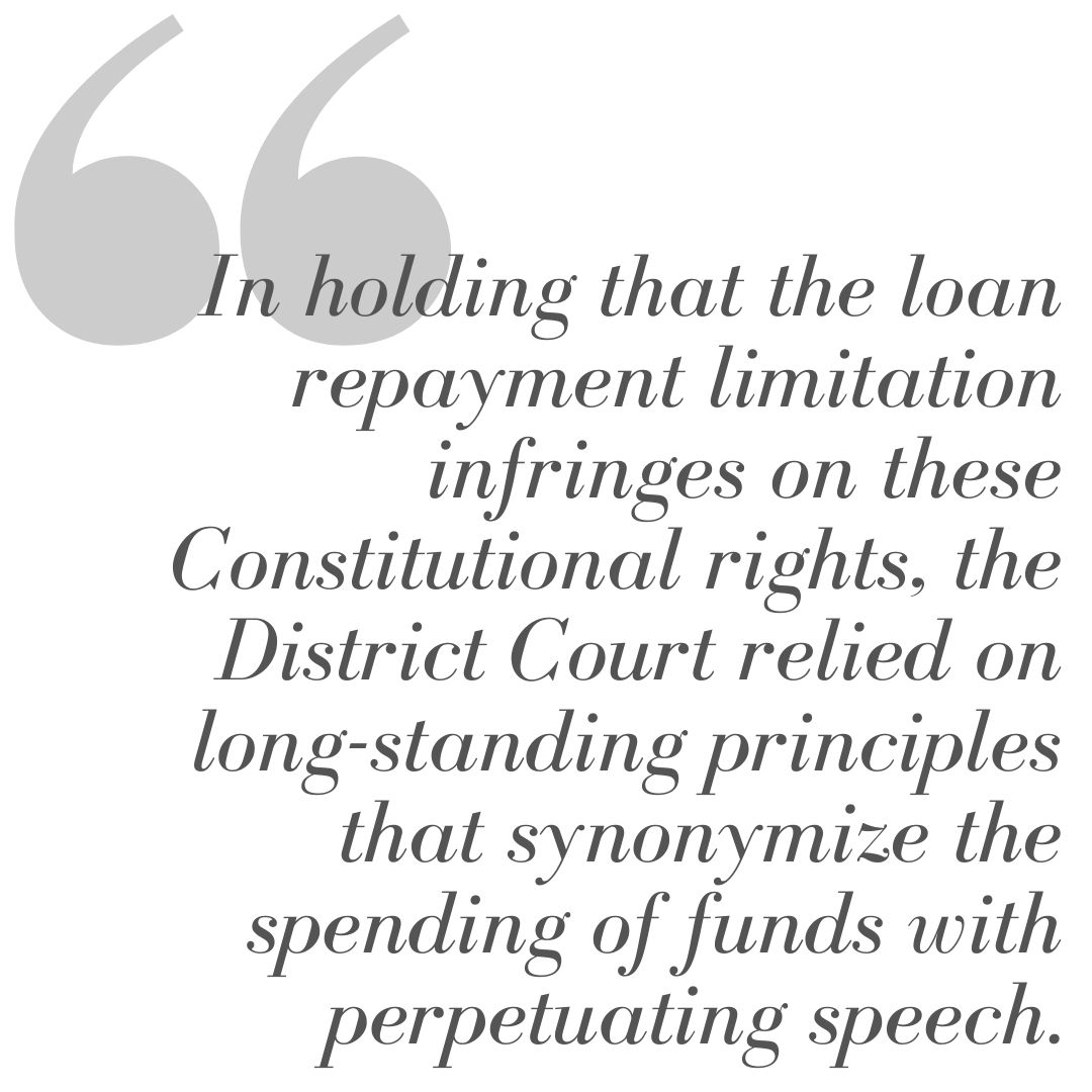 The Court found that the loan repayment limit restricts the First Amendment protected rights of political speech and association for both candidates and their contributors by imposing a constraint on the repayment options available to candidates who choose to make personal loans to their campaigns. In holding that the loan repayment limitation infringes on these Constitutional rights, the District Court relied on long-standing principles that synonymize the spending of funds with perpetuating speech. Specifically, the Court stated, “When a candidate makes expenditures on behalf of her campaign, she exercises her right to speak; and when a contributor donates to that campaign, he exercises the right to associate with the candidate and to express his support. The contributions to a campaign in turn promote more expenditures and political speech by the candidate.” The Court also noted that candidates often self-fund their campaign to get it established in the short-term and that the loan repayment limitation “places a particular burden on relatively unknown challengers who may require more financing up front in order to wage an effective campaign against a better funded incumbent.”