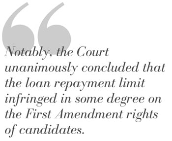 In finding the loan repayment limit unconstitutional, the Majority called such limitation a “drag” on a candidate’s First Amendment rights. Specifically, the Court emphasized personal loans as a “ubiquitous tool for financing electoral campaigns[ ]” as the bulk of the seed money for many current campaigns are personal loans from candidates to get the campaign started. The ability to lend money to campaigns, the Court emphasized, is essential to new candidates and challengers, as they are often fighting uphill battles against incumbents. Notably, the Court unanimously concluded that the loan repayment limit infringed in some degree on the First Amendment rights of candidates.