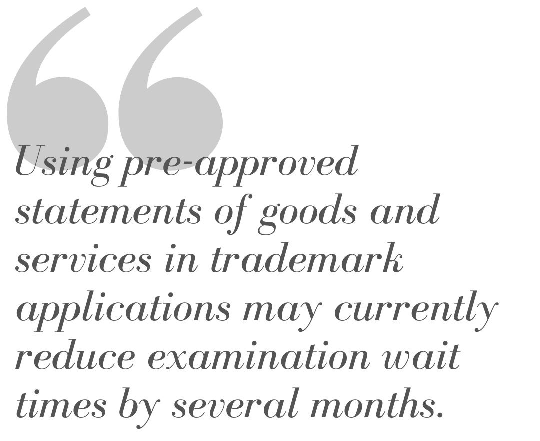 Using pre-approved statements of goods and services in trademark applications may currently reduce examination wait times by several months. The Goods and Services Manual (GSM) has been expanded to include over 100,000 entries.