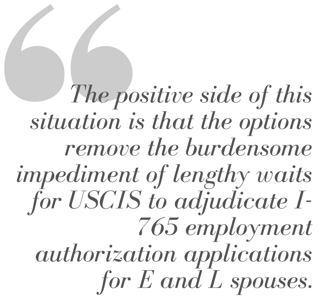 The positive side of this situation is that the options remove the burdensome impediment of lengthy waits for USCIS to adjudicate I-765 employment authorization applications for E and L spouses. The downside is that it would have been much easier to allow a passport and I-94 with the new code to serve as a List A document, in order to be consistent with other work-authorized nonimmigrants “incident to status” (e.g. principal E and L nonimmigrants).