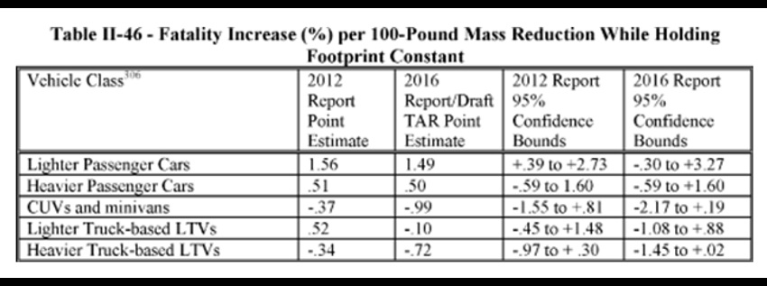 The agencies considered the effect of mass reduction on safety when they proposed the augural standards in 2012 and again in 2016 when they conducted their mid-term review. They calculated the increase in fatalities that resulted from a 100 pound reduction in mass while holding the vehicle footprint constant.4 Their results were as follows: